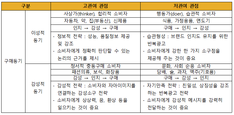 특히 저관여는 친숙함이 구매에 영향을 많이 끼치므로 지속적 노출이 효과적이다.