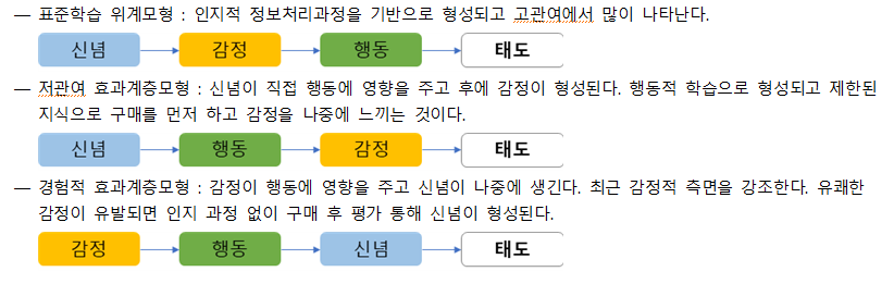 □ 태도 삼각구조이론, 일차원이론 ─ 태도의 특징 ─ 태도의 기능 실리충족적, 지식, 가치표현적, 자기방어적 기능 ─ 태도형성 유형 표준학습 위계모형(고관여) (신념 감정 행동 태도) 저관여 효과계층모형 (신념 행동 감정 태도) 경험적 효과계층모형 (감정 행동 신념 태도)
