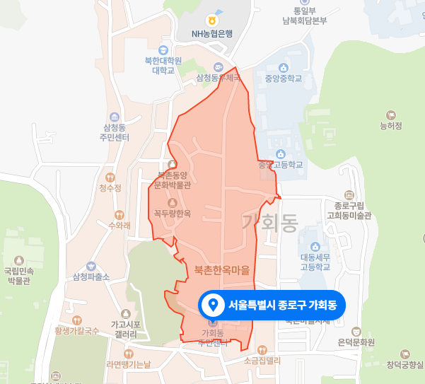 The current Gahoe-dong is surrounded by Gye-dong to the east, Hwa-dong to the west, Jae-dong to the south, and Samcheong-dong to the north. There are many traditional Hanok houses, forming a relatively quiet residential area in downtown Seoul.