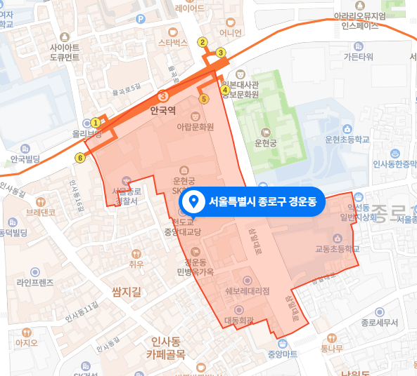 Gyeongun-dong has Unni-dong and Ikseon-dong to the east, Nakwon-dong to the south, Gwanhun-ong to the west, and Anguk-dong and Jaedong to the north, bordered by Yulgok-ro.