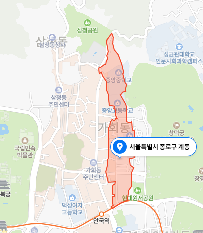 현대건설 본사 건물 뒷쪽으로 가회동과 창덕궁 사이에 있다.