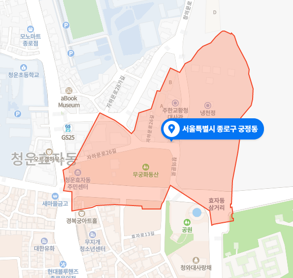 청운동 주민센터에서 청와대쪽 동네이다. 박정희 대통령 때문에 많이 알려진 동 이름이다.