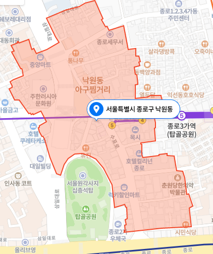 탑골공원 뒷쪽 음식점이 많은 쪽이고 익선동과 접하고 있다.