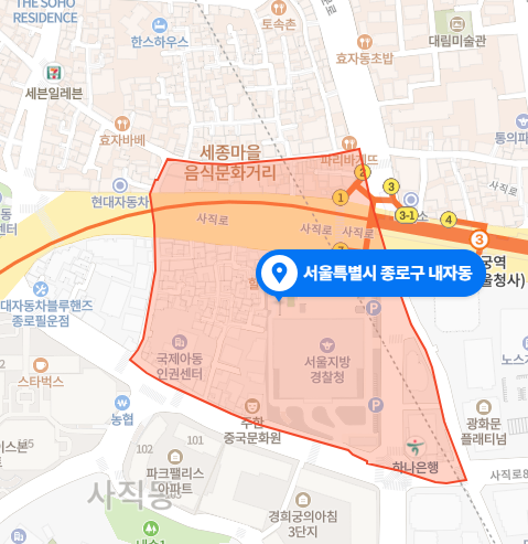 경복궁역, 서울지방경찰청, 세종마을 먹자골목을 아우르는 동네이다.