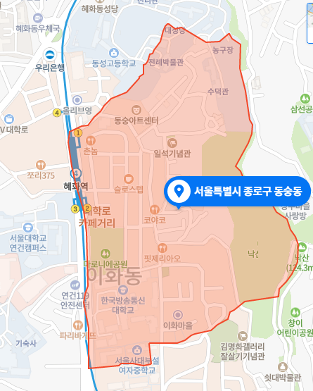 낭만과 젊음이 넘치는 동숭동에는 대학로를 인접하여 마로니에 공원을 비롯하여 많은 문화공간이 하나의 타운을 형성하면서 이채로운 주변 환경과 함께 발전하고 있다.