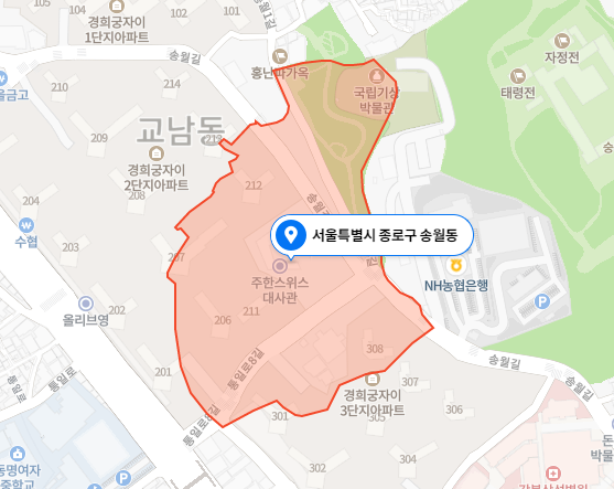 현재의 송월동은 북으로 홍파동, 서쪽으로 교남동, 남쪽으로 평동, 동쪽으로 세종로동이 위치하여 있고 송월동 32 - 10번지에는 스위스대사관이 있다.
