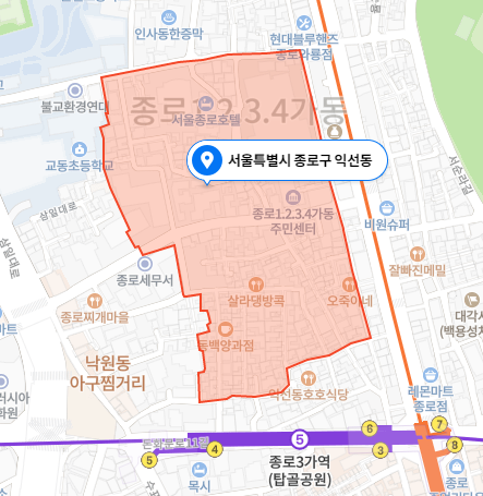 익선동은 동으로 와룡동, 남으로 돈의동이 서쪽은 경운동과 낙원동이 둘러싸고 있으며 북쪽은 운니동과 접해 있는 전형적인 주택지구이다 .