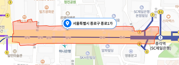 현재의 종로1가 동쪽은 종로2가와 연해있고 서쪽은 신문로1가와 접해 있으며 남쪽은 서린동, 북쪽은 청진동과 이웃하고 있다. 폭 40m의 종로가 동면적의 거의 대부분을 차지하며 청진동쪽과 이웃하고 있는 부분만 상업지역으로 활용되고 있다.