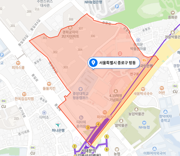 현재의 평동은 북으로 송월동과 세종로동, 서쪽은 서대문구 냉천동, 동쪽과 남쪽으로는 새문안길을 경계로하여 서대문구 충정로2가와 접하고 있으며 평동 108 - 2번지에는 스웨덴 대사관 있다.
