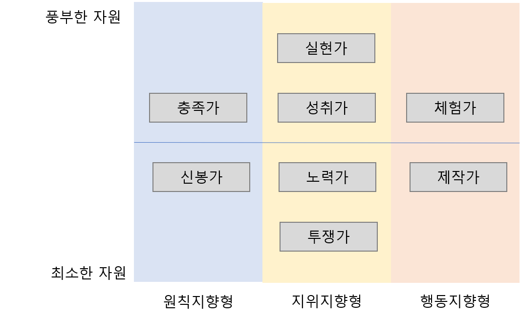 - 성취가 : 보수적이고 성공과 경력을 지향하고 위험회피 경향. 권위와 성공을 과시하는 성향.