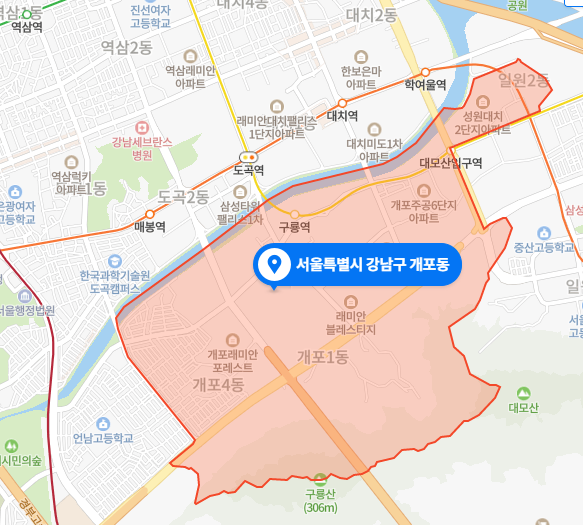 개포동 동명은 이 지역이 양재천 갯벌에 있으므로 개펄이라 하던 것이 변하여 개패 또는 한자명으로 開浦라 한 데서 유래되었다. 개포동은 1962년까지 盤浦里라 불렸는데, 지금 대치동 미도아파트 일대에 소반같이 생긴 浦口가 있어 소반 ‘盤’자를 따서 ‘盤浦里’라고 하였다. 그러나 1963년 1월 1일 서울시에 편입되면서 현 서초구 반포동과의 동명 중복을 피하기 위해 개포동으로 개칭한 것이다. 개포동은 조선시대 말까지 경기도 廣州郡 彦州面 浦一洞・盤谷洞 일부였으며, 1914년 3월 1일 조선총독부령 제111호와 동년 4월 1일 경기도령 제3호에 의한 경기도 구역획정 때 경기도 광주군 언주면 반포리가 되었다. 광복 후 1963년 1월 1일 법률 제1172호에 의한 서울시 행정구역 확장에 따라 경기도 지역의 12개 면 89개 리와 함께 서울시에 편입되어 동명이 개포동으로 개칭되어 오늘에 이른다. 서울시에 편입되면서 개포동은 서울특별시조례 제276호에 의해 설치된 성동구 언주출장소의 관할 하에 있었으며, 1973년 7월 1일 서울특별시조례 제780호에 의해 언주・송파・숭인・노해출장소가 폐지되고 영동출장소가 신설될 때 개포동은 성동구 영동출장소에 속하였다. 1975년 10월 1일 대통령령 제7816호로 성동구로부터 강남구가 분리 신설될 때 강남구에 편입되었다.