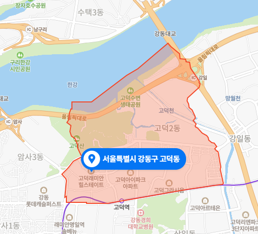 고덕동 동명은 고려 말에 형조참의를 지낸 李養中이 조선 건국을 반대하여 이곳에 와서 숨어 살면서 벼슬 제의도 거절하는 굳은 절개를 지켜 주위로부터 덕이 높은 인물로 추앙받았던 데서 유래되었다. 또 조선시대 지명인 古多只洞이 음운변동으로 이루어졌다고도 한다. 고덕동은 조선시대에 경기 廣州牧에 속하였으며, 1895년 윤5월 1일 칙령 제98호에 의해 전국이 23부 337군으로 개편될 때 한성부 11개 군 중 廣州郡에 속하였다. 이듬해 1896년 8월 4일 칙령 제36호로 전국을 다시 13도 339군으로 개정하고 5등으로 구분하였는데, 고덕동은 경기도 38군 중 1등에 해당되는 廣州府에 소속되었으며, 1906년 10월 1일 칙령 제48호에 의해 광주부는 광주군으로 개칭되었는데, 고덕동은 광주군 龜川面에 속하였다. 1914년 3월 1일 조선총독부령 제111호와 동년 4월 1일 경기도령 제3호에 의한 경기도 구역획정 때 이 지역의 가재울・비석말・방죽말・동자골의 일부를 병합하여 경기도 광주군 九川面 고덕리가 되었다. 광복 후 1963년 1월 1일 법률 제1172호에 의한 서울시 행정구역 확장에 따라 서울시에 편입되어 고덕동이 되었으며, 서울특별시조례 제276호로 설치된 성동구 천호출장소의 관할을 받게 되었다. 1975년 10월 1일 대통령령 제7816호에 의해 성동구에서 분리 신설된 강남구에 이속되었으며, 1979년 10월 1일 대통령령 제9630호로 천호출장소를 區로 승격시켜 강동구를 신설함에 따라 고덕동은 강동구에 속하여 오늘에 이른다.