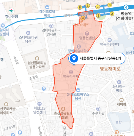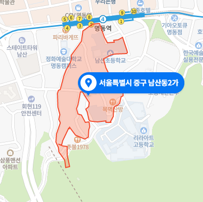 남산동1가 동명은 남산 남쪽 기슭 아래에 있는 마을이라 하여 남산골이라고 하였던 것을 한자명으로 표기한 데서 유래되었다. 남산동은 조선 초기 한성부 남부 명례방에 속했으며, 영조 27년(1751)에 간행된 ≪도성삼군문분계총록≫을 보면 한성부 남부 명례방 장악내계에 해당되었다. 1894년 갑오개혁 때 5부를 5서로 개편하면서 한성부 남서 명례방 남산동계 남산동이 되었다. 1910년 10월 1일 조선총독부령 제7호로 한성부는 경성부로 바뀌었으며, 1914년 4월 1일 경성부 구역 획정에 따라 경기도고시 제7호에 의해 남부 명례방 남산동을 셋으로 분리하여 남산정1・2・3정목이라 하였는데 그 중 서쪽 방면을 남산정1정목으로 하였다. 1943년 6월 10일 조선총독부령 제163호에 의해 區制度가 실시되면서 중구 남산정1정목이 되었으며, 1946년 10월 1일 일제식 동명을 우리 동명으로 바꿀 때 남산동1가로 하였다.
