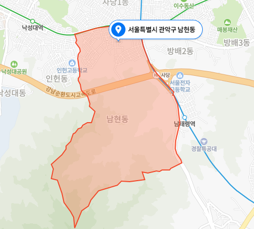 남현동 동명은 이 지역에 있는 南峴, 즉 南泰嶺이 있는 데서 유래되었다. 남현동은 조선시대 말까지 경기 과천군에 속하였다. 그런데 갑오개혁에 의하여 1895년 윤5월 1일 칙령 제98호로 인천부 소속 13군의 하나로 과천군도 인천부에 속하였다가 1896년 8월 14일 道制의 환원으로 경기도 관할로 되어 경기도 과천군이 되었다. 1914년 3월 1일 조선총독부령 제111호와 동년 4월 1일 경기도령 제3호에 의한 경기도 구역획정 때 과천군은 인근 시흥군・안산군과 병합하여 시흥군이 됨에 따라 남현동 지역은 시흥군 신동면의 사당동에 속하였다. 광복 후 1963년 1월 1일 법률 제1172호에 의한 서울특별시 행정구역 확장에 따라 신동면이 서울시에 편입되어 영등포구 신동출장소 관할의 사당동이 되었다. 1973년 7월 1일 대통령령 제6548호에 의해 관악구가 신설되면서 관악구에 속하였으며, 1980년 4월 1일 대통령령 제9630호로 관악구에서 동작구를 분리 신설하면서 서울특별시조례 제1362호로 관악구 관할 사당제1동 지역을 남현동으로 명명하여 새로운 동이 신설되었다. 즉 사당제1동에서 남현동이 새로 분동되어 관악구에 속하게 되고 원래의 사당제1동은 신설된 동작구에 속하여 오늘에 이른다.
