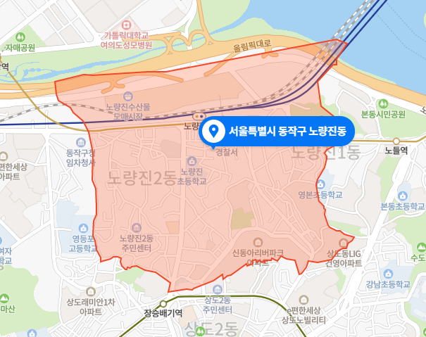 노량진동 동명은 白鷺가 노닐던 나루터라는 뜻에서 유래되었다. 일설에는 수양버들이 울창하여 노들나루라 하였다고 한다. 노량진동은 조선시대 말까지 경기도 과천군 하북면 신촌분리・옹점리・옹막리・고등리 지역이었으며, 1914년 3월 1일 조선총독부령 제111호와 동년 4월 1일 경기도령 제3호에 의한 경기도 구역획정 때 시흥군 북면 노량진리로 칭하였다. 그 후 1936년 4월 1일 조선총독부령 제8호에 의해 경성부에 편입되어 경성부 노량진정이 되었고, 1943년 6월 10일 조선총독부령 제163호로 區制度가 실시되면서 영등포구에 속하였다. 광복 후 1946년 10월 1일 일제식 동명을 우리 동명으로 바꿀 때 영등포구 노량진동이 되었다. 1973년 7월 1일 대통령령 제6548호로 영등포구에서 관악구를 분리 신설할 때 관악구에 이속되었고, 1980년 4월 1일 대통령령 제9630호로 관악구에서 동작구를 분구하면서 노량진동은 동작구에 속하여 오늘에 이른다.