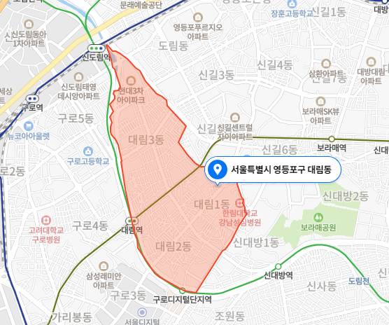 대림동 동명은 신대방동의 ‘대’자와 신도림동의 ‘림’자를 따서 합성한 데서 유래되었다. 대림동은 조선시대에는 경기 시흥현 상북면에 속하였으며, 갑오개혁의 추진에 따라 1895년 윤5월 1일 칙령 제98호에 의해 8도제를 폐지하고 23부제를 시행하면서 인천부 시흥군 상북면에 속하였다가 1896년 8월 4일 칙령 제36호에 의해 실시된 13도제에 따라 다시 경기도에 속하게 되었다. 1914년 4월 1일 경기도령 제3호에 의해 시흥군 상북면・하북면과 과천군 하북면・상북면 일부를 합하여 시흥군 북면을 신설하고, 시흥군 상북면의 사돈리・도야미리・원지목리를 합하여 도림리라 하고, 시흥군 하북면의 번대방리와 우와피리를 합하여 번대방리로 명명한 것이다. 1936년 4월 1일 조선총독부령 제8호로 경성부의 구역을 확장할 때 시흥군 북면 도림리와 번대방리는 상도천 우안을 경계로 하여 경성부에 편입되었기 때문에 한 개의 리가 두개로 분할되어 북면 중에서 경성부에 편입되지 않은 도림리와 번대방리는 구로리와 함께 시흥군 동면(북면은 없어짐)에 흡수되었다. 1949년 8월 13일 대통령령 제159호에 의한 서울시 행정구역 확장 때 경기도 시흥군 동면의 구로리・도림리・번대방리를 편입하여 영등포구의 구로동・신도림동・신대방동으로 명칭을 변경하고 행정동명을 신대방동과 신도림동을 합하여 대림동이라 하였다. 이때 1936년에 편입된 도림동・대방동과 구별하기 위하여 신도림동・신대방동으로 명명한 것이다. 1980년 4월 1일 대통령령 제9630호로 영등포구에서 구로구가 분구될 때 서울특별시조례 제1362호에 의해 도림천 우안 지역의 신도림동은 행정동명인 대림동을 법정동명으로 변경하고 영등포구에 잔류하게 되었다.