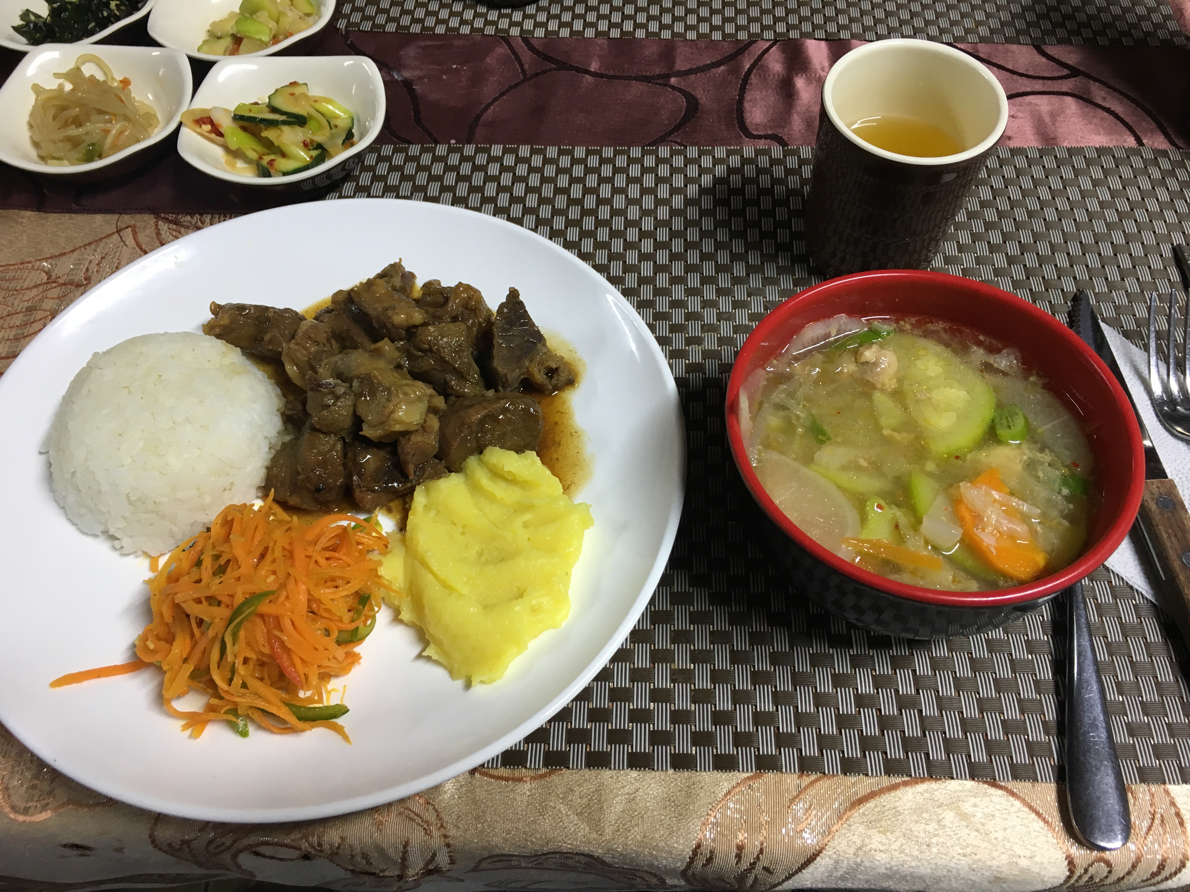 게르 사장님이 한국에도 계셨다고 해서 그런지 한국식 밑반찬도 있었다. 국물은 닭계장 같은 국물이었다. 이때를 시작으로 매 끼마다 고기의 향연(?)이 벌어진다. ㅎ