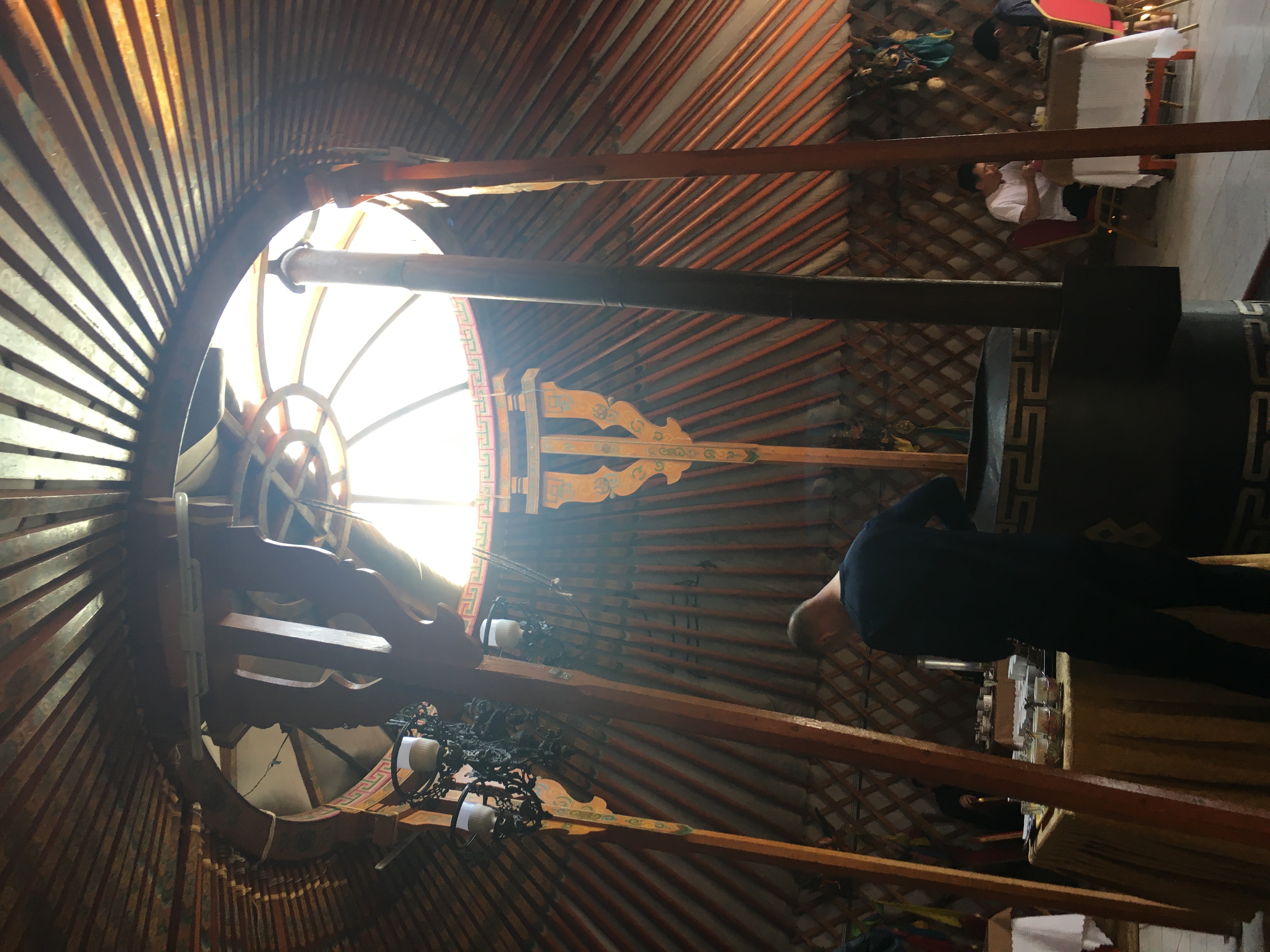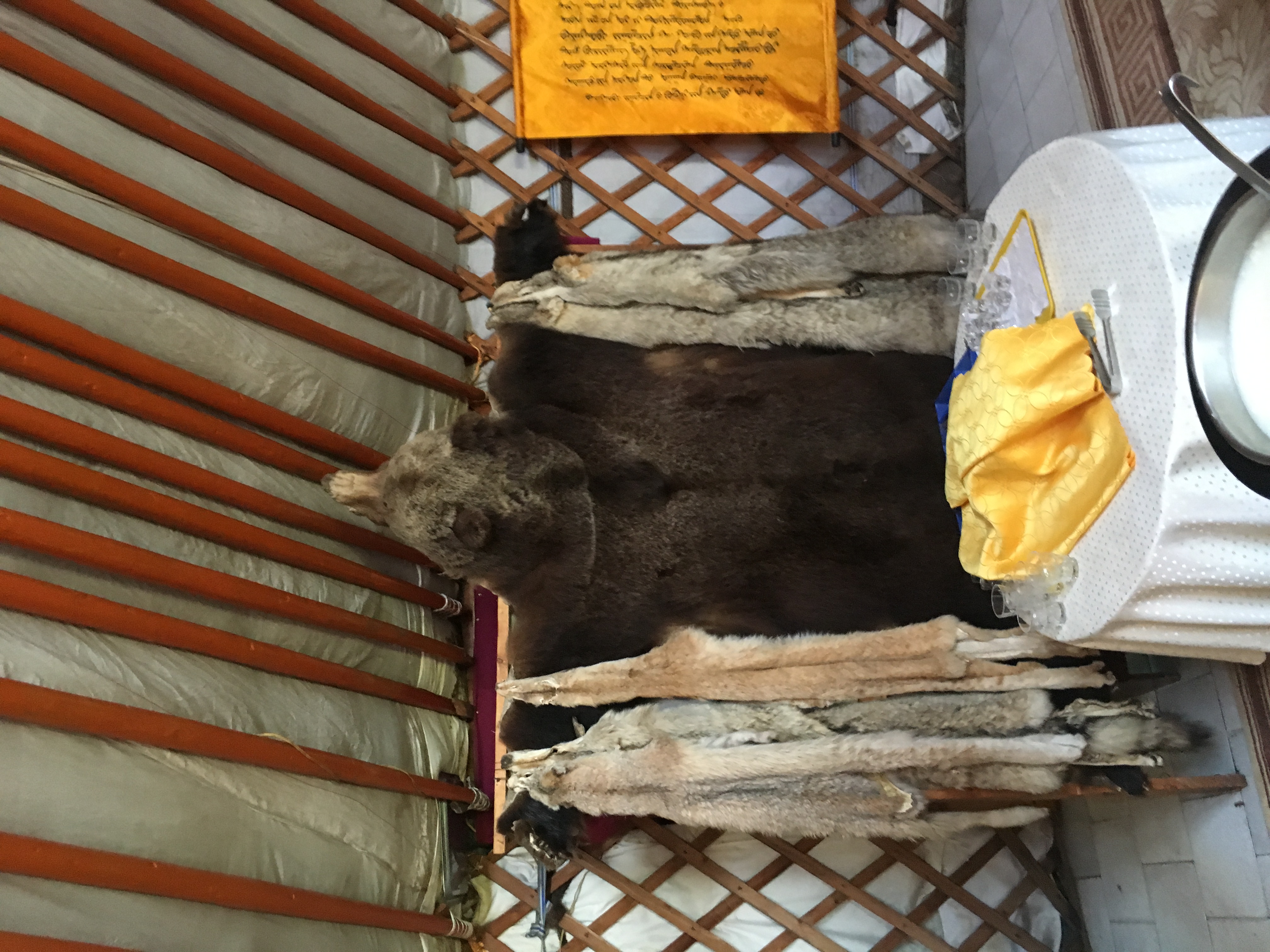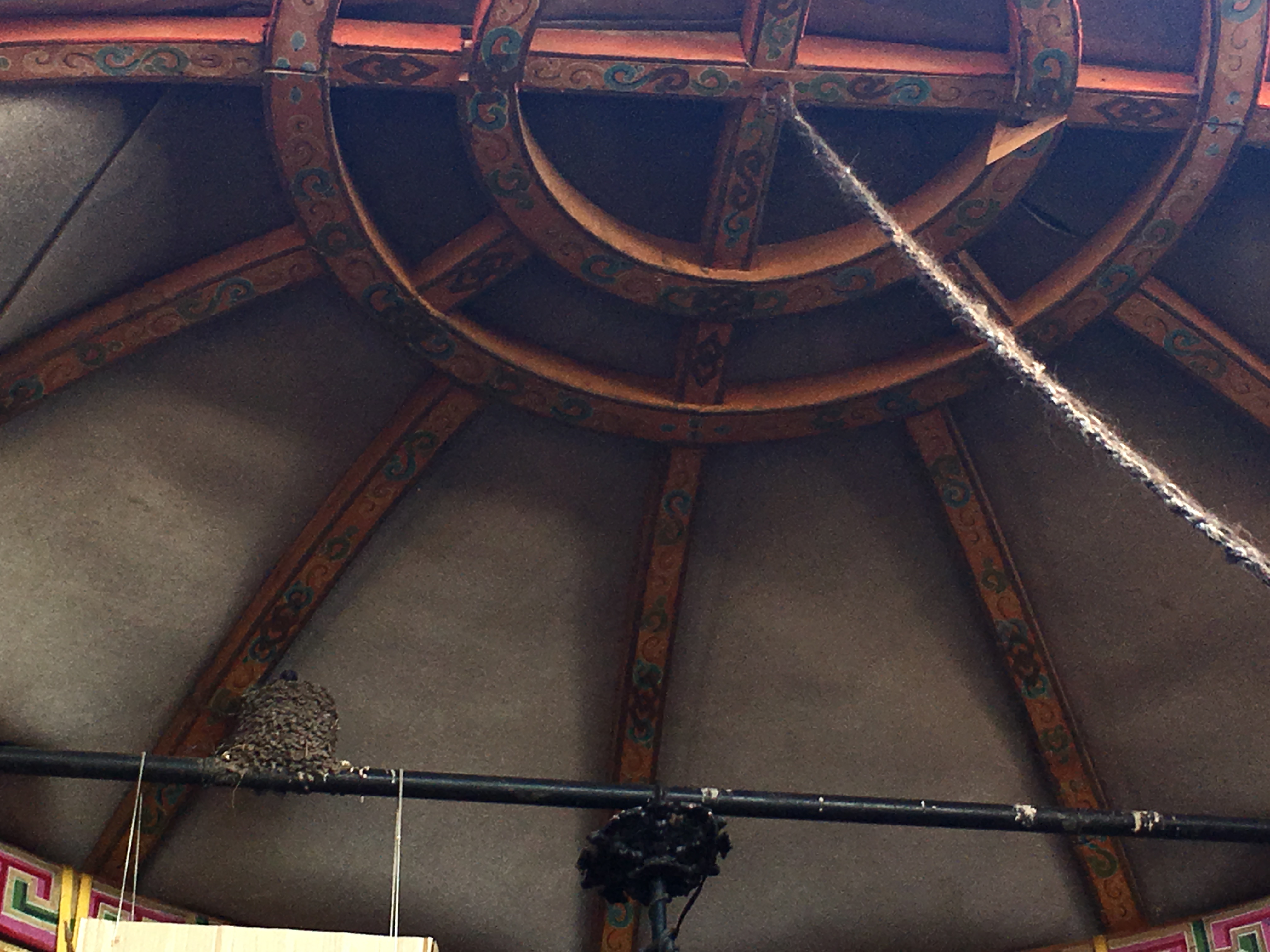 식당 게르에는 제비가족이 살고 있었다. 게르 지붕쪽에 제비집이 있어서 수시로 제비들이 들어왔다가 게르안을 빙 돈 다음에 바깥으로 나가곤 했다. 안쪽에는 곰가죽, 늑대가죽 등이 걸려 있다.