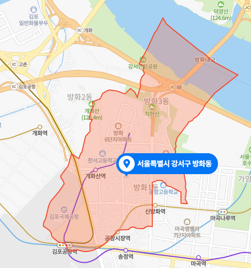 방화동 동명은 이 지역이 개화산 옆에 있는 데서 유래되었다. 방화동은 조선 초기까지 양천현 지역이었으나 곧 금천군이 되었으며, 인조 때 양천군으로 잠시 승격되었다가 숙종 때 다시 양천현이 되었다. 갑오개혁 직후인 1895년 윤5월 1일 칙령 제98호에 의해 실시된 23부제에 의해 인천부 양천군 군내면이 되었으며, 이듬해 1896년 8월 4일 칙령 제36호로 실시된 13도제에 의해 다시 경기도에 속하였다. 1914년 4월 1일 일제가 경기도령 제3호에 의해 양천군은 김포군・통진군과 합하여 김포군이 되었고, 양천군 삼정면의 정곡리・치현리・능리를 합하여 김포군 양서면 방화리로 칭하였다. 1963년 1월 1일 법률 제1172호에 의한 서울특별시역 확장으로 김포군의 양동면과 양서면(옛 양천군 지역)이 서울특별시역에 편입될 때 방화리는 서울특별시 영등포구 방화동이 되었다. 새로 편입된 지역을 관할하기 위해 서울특별시조례 제276호에 의해 동일자로 영등포구에 5개의 출장소를 신설하였는데, 이때 방화동은 양서출장소에 속하였다. 1977년 9월 1일 대통령령 제8666호로 영등포구에서 분리하여 강서구를 신설할 때 방화동은 강서구에 속하여 오늘에 이른다.