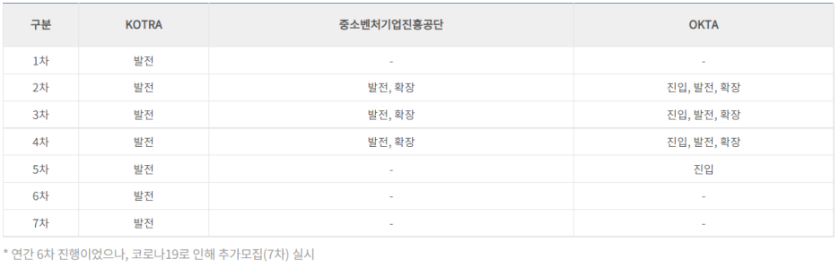 - 3개 기관의 유사사업(KOTRA-지사화사업, KOSME-민간네트워크 활용사업, OKTA-글로벌 마케터)을