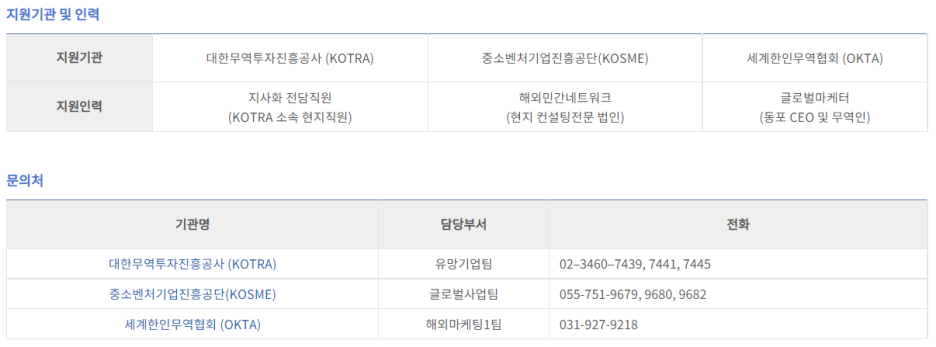 - 대한무역투자진흥공사(KOTRA), 중소벤처기업진흥공단(KOSME), 세계한인무역협회(OKTA)