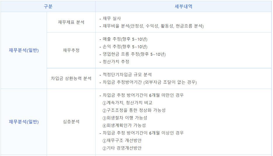 기업진로 분야의 전문가가 기업을 방문·진단하여 해당기업의 향후 진로에 대한 맞춤형 처방* 을 제시 * 구조개선전용자금 지원, 회생컨설팅 연계, 사업정리컨설팅 연계 지원 대상 현재 기업경영에 애로를 겪고 있거나, 향후 경영악화가 예상되는 기업으로 구조개선·회생절차 등 진로제시 진단을 희망하는 기업 - 이자보상배율 1이하(영업이익 < 이자비용) - 대기업의 구조조정, 자유무역협정(FTA) 체결 등의 사업영위 환경의 변화로 인해 경영악화가 예상되는 경우 등 회생신청 준비 기업으로, 서울회생법원의 뉴-스타트 상담센터를 통해 기업회생 상담을...