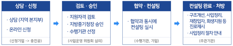 - 상담신청-검토·승인-협약·컨설팅 실시·완료-처방 제시
