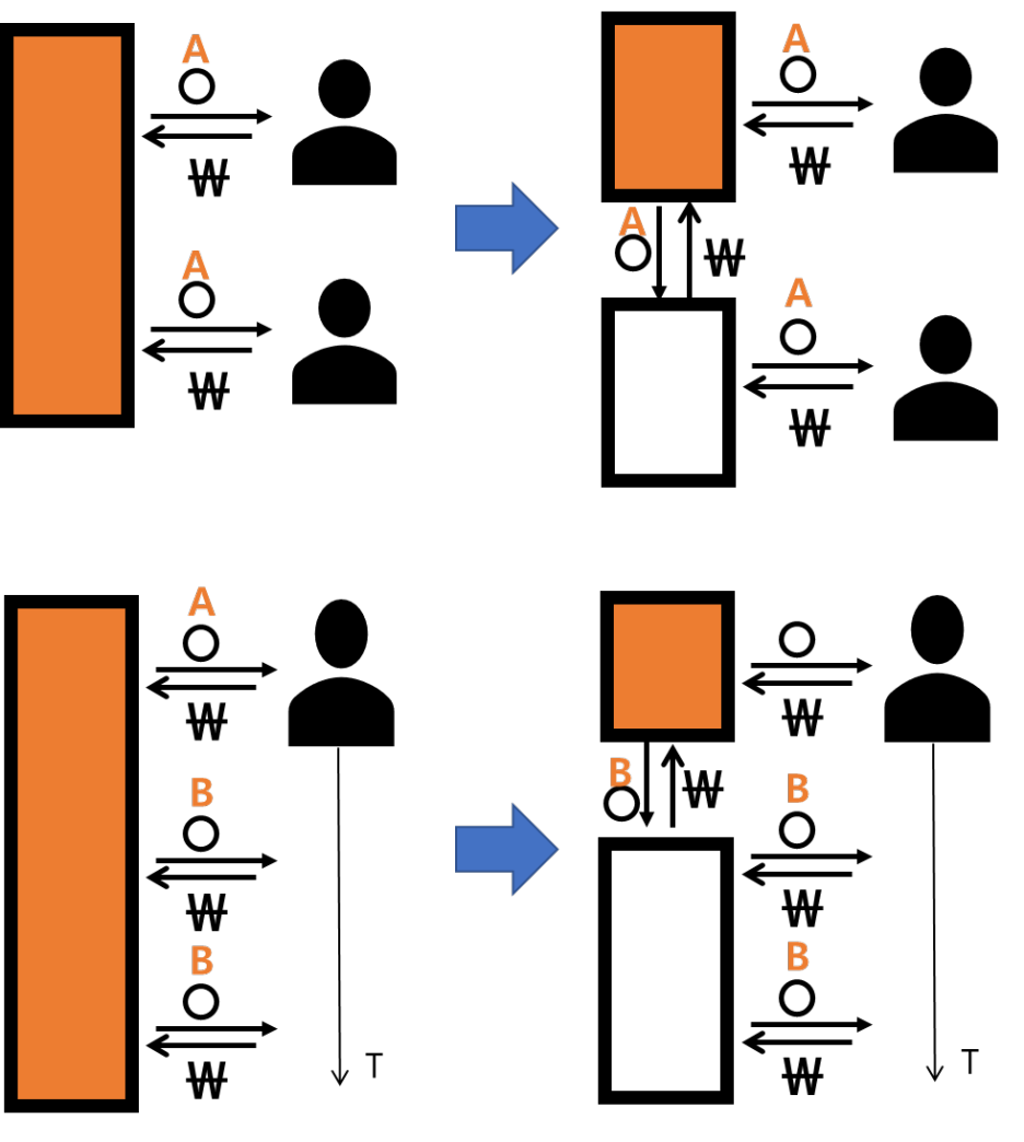 위의 예시는 기존 자사 상품을 판매하던 비즈니스에서 새로운 상품을 구매하여 판매하는 새로운 형태의 수입이 추가된 형태 입니다.