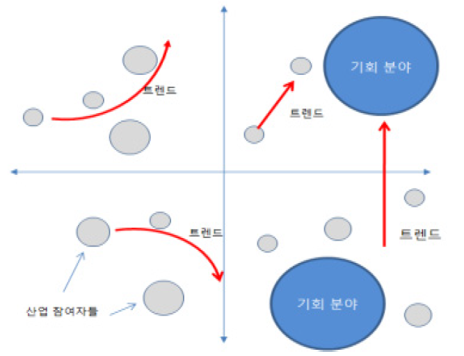 가능한 창업 기회를 4분면 지도 위에서 찾을 수 있도록 도와주는 방법입니다. 이 방법은 트렌드와 변화에 관한 깊은 이해에 근거하여 중요하다고 판단되는 창업의 두 가지 핵심 요소를 도출하는 과정으로 시작됩니다. 지도에는 그 분야에서 활동하는 다양한 참가자들이 표시됩니다. 이 방법은 초기에 창업에 관한 기회를 파악하기 위해 효과적으로 사용되는 방법으로 ‘어느 분야에서 창업의 기회를 찾을까?’ 하는 질문에 유용한 방법입니다.