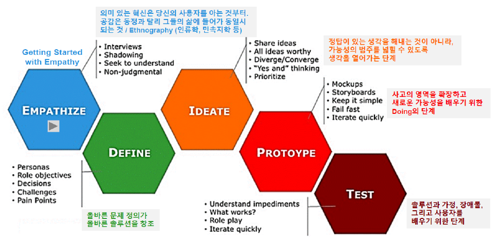 이렇게 확산과 수렴을 두 번 반복하여 도형상으로 두 개의 다이아몬드가 연속된다는 모양이어서 디자인씽킹의 더블다이아몬드모델(Double Diamond Model)이라고 부릅니다. 이와같이 사고의 확산과 수렴을 타고 5단계의 프로세스를 거치게 되는데 각 단계마다 의미와 실행 방안이 매우 중요합니다. 왜냐하면 디자인씽킹은 융합적인 사고로 실제 실행이 바탕이 되어야 하는 팀작업이기 때문입니다.