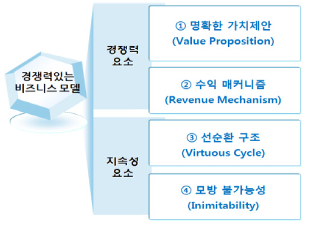 성공적인 비즈니스 모델은 많은 고객을 유인할 수 있어야 되며 이를 수익과 연결시킬 수 있어야 합니다. 또한, 가치창출을 위한 활동들이 선순환적인 구조를 형성하여 경쟁자들이 쉽게 모방할 수 없게 설계가 되어야지만 경쟁력과 지속성을 확보할 수 있습니다.
