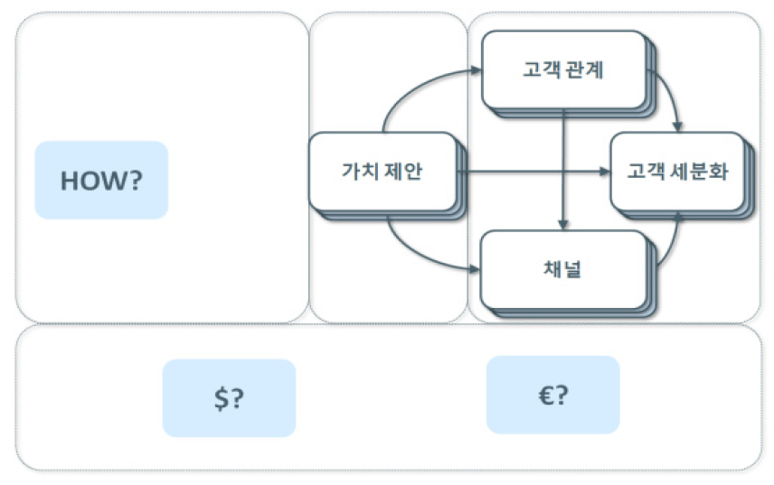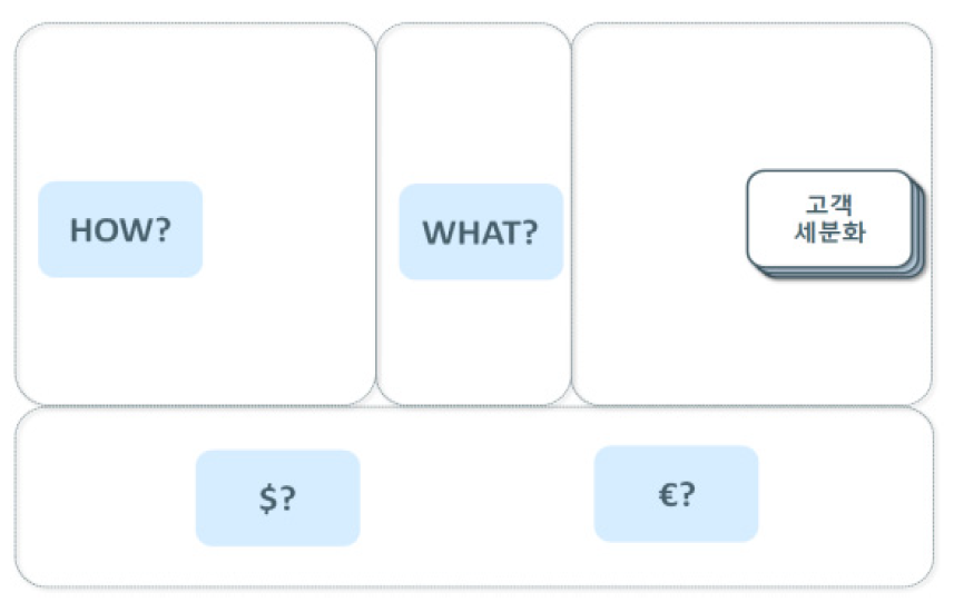 4가지 영역은 제품에 대한 개념을 설명하는 ‘무엇을’, 타깃 고객을 선정하기 위한 ‘누구에게’, 제품의 필요자원, 전략 등을 포함하는 ‘어떻게’, 그리고 예상비용을 산정하고 수익을 측정하는 ‘얼마나’로 구성되어 있습니다.