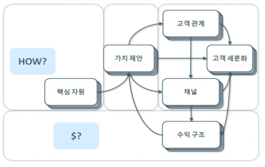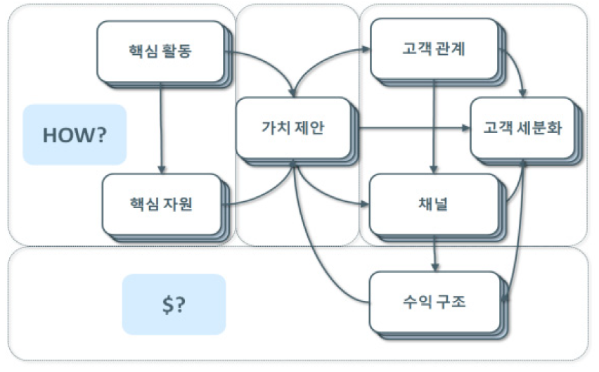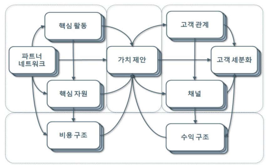 9가지의 빌딩블록(고객세분화, 가치 제안, 채널, 고객관계, 매출구조, 핵심자원, 핵심활동, 핵심 파트너, 비용구조)을 하나의 캔버스에 그려 넣은 것이 비즈니스 모델 캔버스입니다.