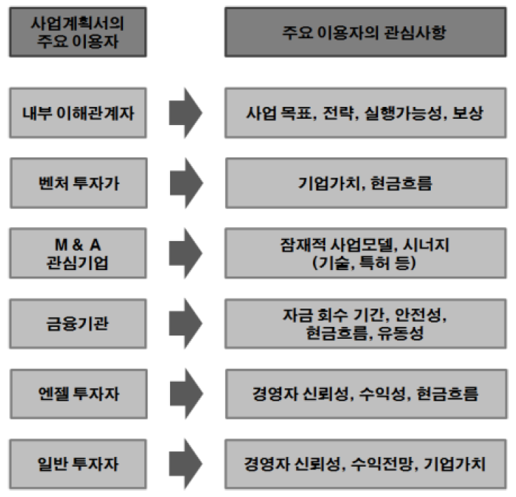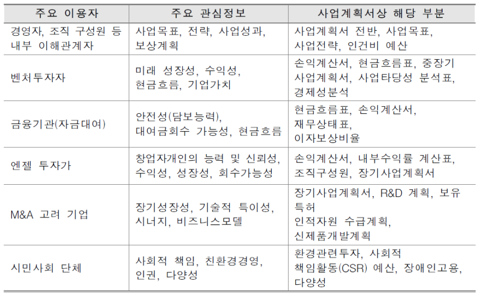 이때 주요 외부이용자와 그들이 의사결정을 함에 있어서 고려하는 핵심 관심 사항을 이해하는 것이 매우 중요합니다. 주요 외부 이해관계자에 따라 관심을 갖는 정보가 다르고 이에 맞춰 사업계획서에서도 다르게 나타내야 합니다.