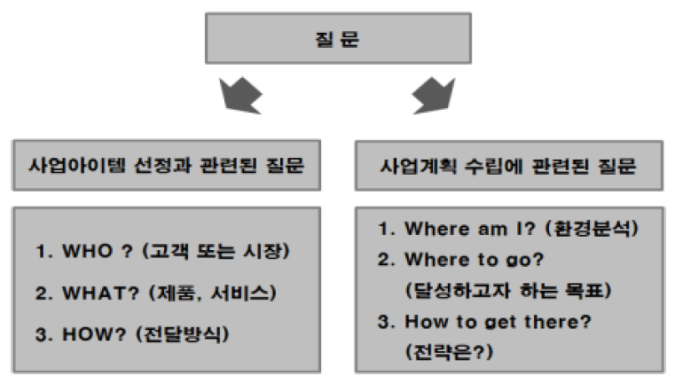 - 자원 : 사업자 자신이 보유한 물적, 인적자원은 무엇이며 사업자가 외부로부터 동원해야할 물적, 인적자원은 무엇일까? 그리고 이들 자원이 사업에 어떤 기여를 할 수 있을까?