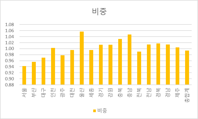 특징적인 지역은 광주, 울산, 세종, 경기, 충남, 제주가 어린이 비중이 높다. 광주는 나주 혁신도시, 울산은 공업단지, 세종은 공무원 등 최근 젊은 층이 이동이 많은 지역들이다.