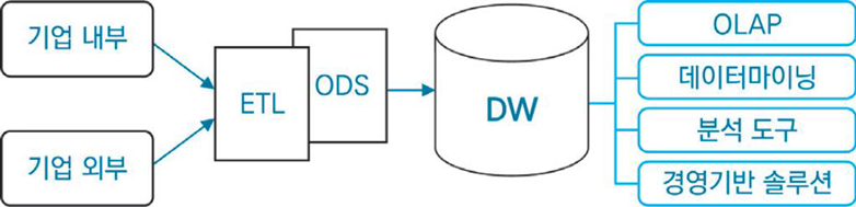 - ETL : 기업의 내부/외부에서부터 데이터를 추출, 정제 및 가공하여 데이터웨어하우스에 적재