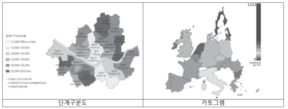 ① 장소나 지역에 따른 데이터의 분포 표현 (단계구분도, 카토그램 등)