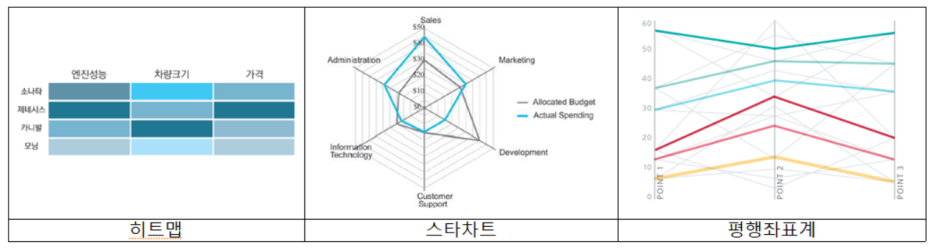 ① 하나 이상의 변수에 대해 변수 사이의 차이와 유사성 등을 표현 (히트맵, 체르노프 페이스, 스타차트,
