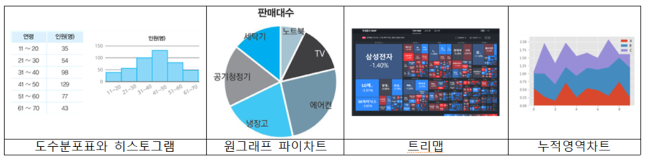 - 막대그래프 : 일정기간에 걸쳐 진행되는 변화를 표현하기에 적합. 특정 기업의 매출을 월별로 구분해서 표현