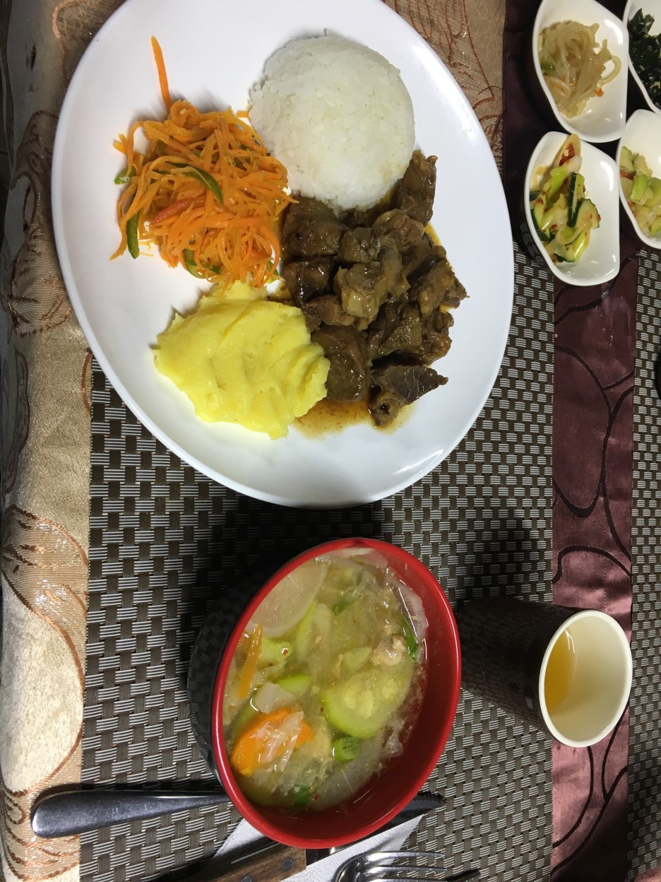 게르 사장님이 한국에도 계셨다고 해서 그런지 한국식 밑반찬도 있었다. 국물은 닭계장 같은 국물이었다. 이때를 시작으로 매 끼마다 고기의 향연(?)이 벌어진다. ㅎ