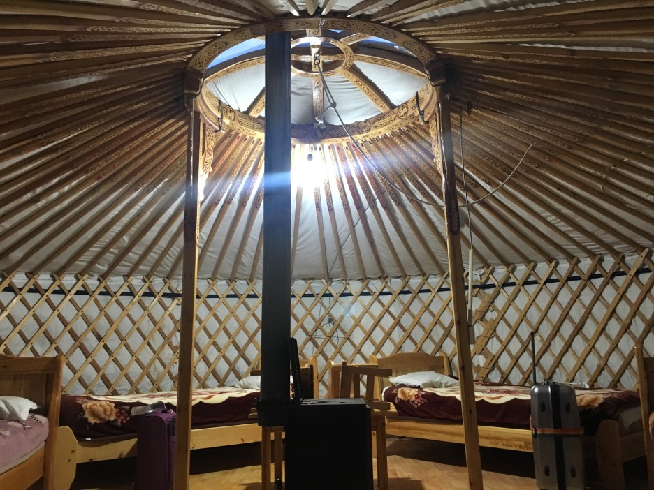게르는 나무를 조립한 뼈대에 가죽과 천으로 둘러싼 형태로 못질이 없고 하나하나 엮어서 만든 형태이다. 막상 들어가 보니 생각보다 안쪽이 넓었고 침대도 편한하고 전기도 들어와 꽤 괜찮은 숙박시설이었다.
