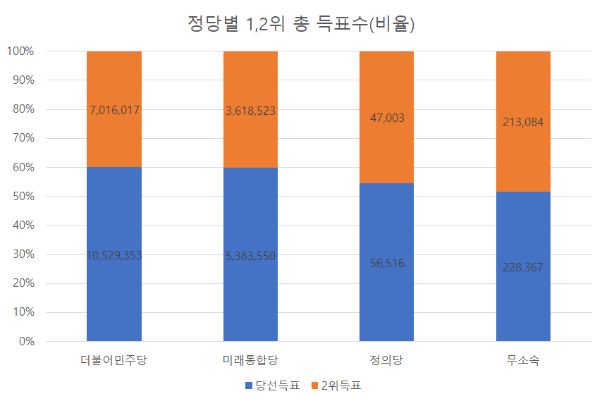 | 정당 | 당선자 득표수 | 2위 득표수 | 합계 |