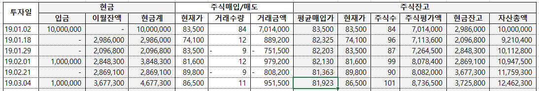 * 3월 4일 신규 100만원을 투자한다. 현재가 86,500원이어서 11주를 951,500원에 매입하였다.