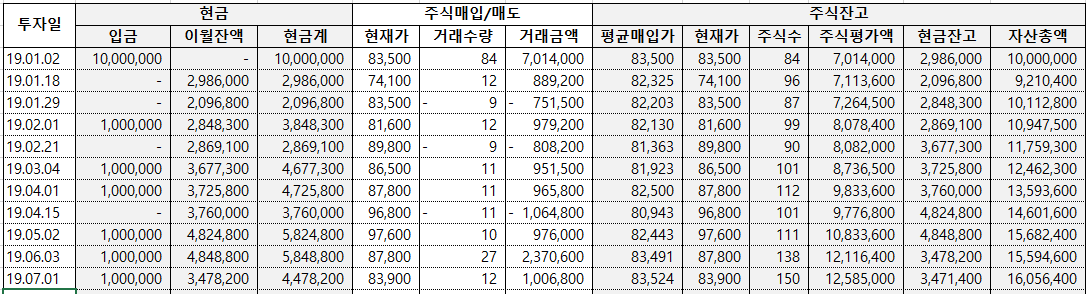 * 7월 1일 신규 100만원을 투자한다. 현재가 83,900원이어서 12주를 1,006,800원에 매입한다.