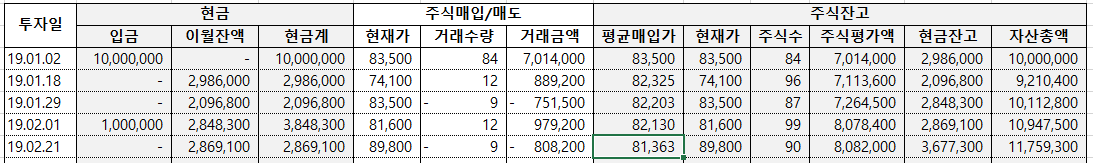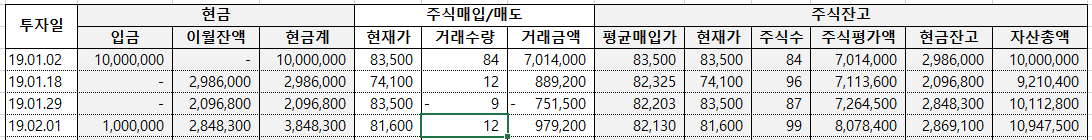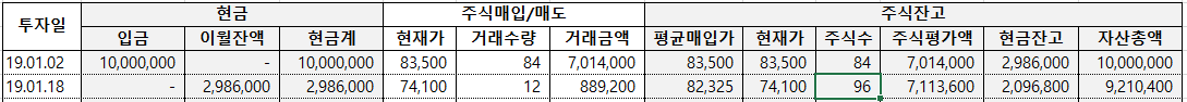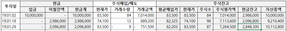 * 1월 18일 기준가인 83,500원보다 10%이상 하락하여 74,100원이 되었다. 평가액의 15%인 933,660원(현재가 74,100원*주식수 84주 *15%) 가량인 12주를 889,200원에 매입하였다.