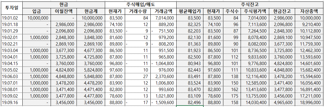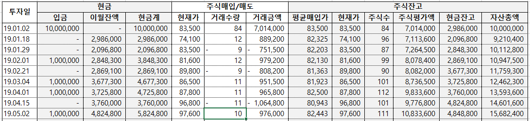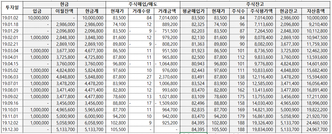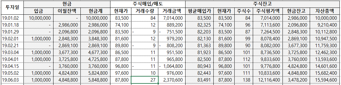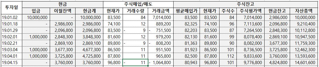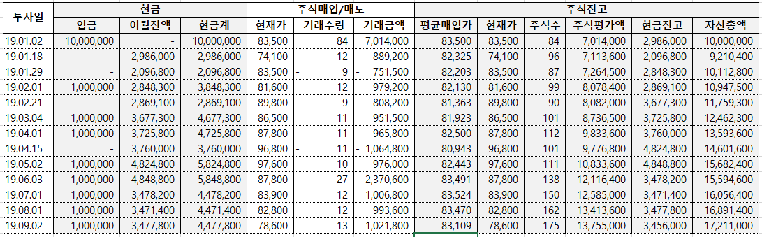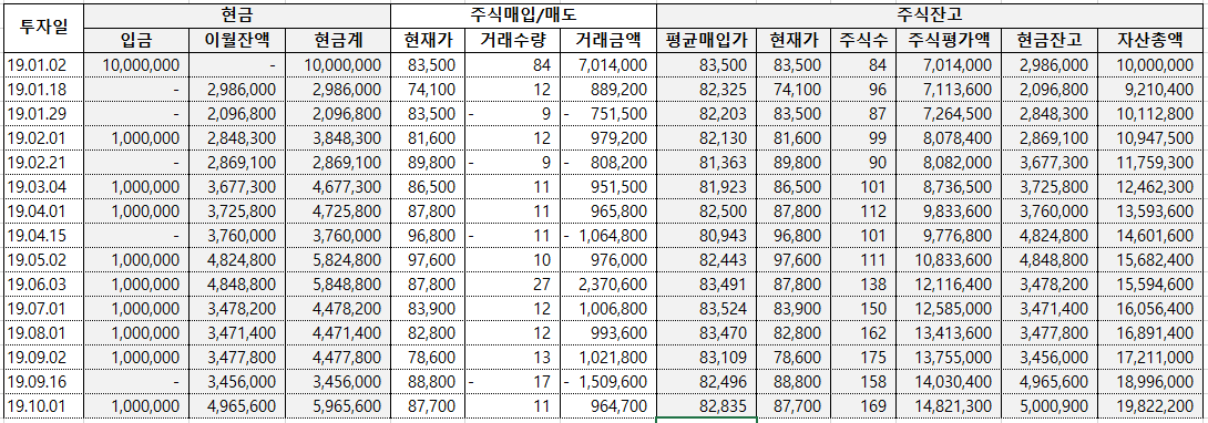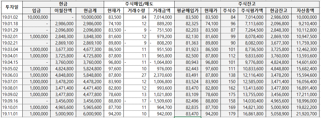 여유자금 1,000만원이 있고 매월 100만원씩 투자를 할 수 있는 상황이다. 수익금 계산을 할 때 편의를 위해 증권거래수수료와 세금은 감안하지 않을 예정이다. 주가는 종가를 기준으로 계산해 보도록 하자.