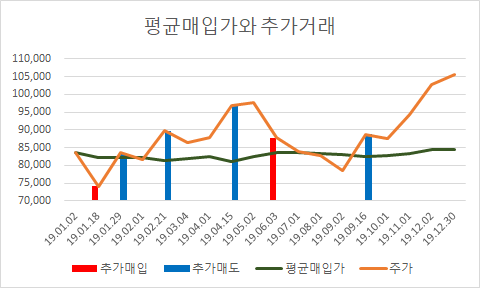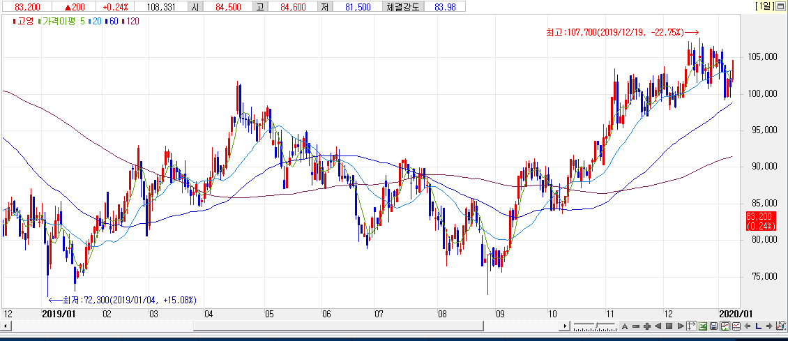 참고로 연초 1월 83,500원에서 최저 72,300원까지 떨어졌다 최고 107,700원가지 올라갔다가 연말 105,500원이 된 주식이다.