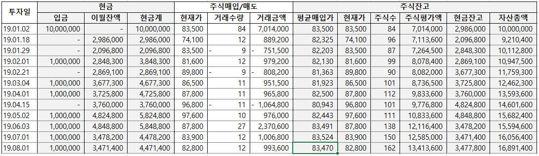* 8월 1일 신규 100만원을 투자한다. 현재가 82,800원이어서 12주를 993,600원에 매입한다. 주가가 고점 101,100원 대비 18%이상 빠졌다. 분할매수를 해서 단가를 낮춰놓은 덕에 0.8%밖에 빠지지 않았다.