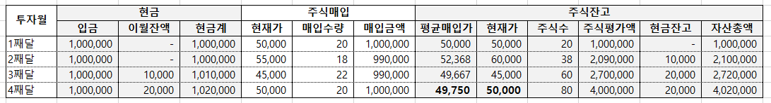 현재 주가가 50,000원이라면 20주를 사고, 다음달에 55,000원이 되었다면 18주를 사고 나머지 1만원은 다음달 주식 살 때 보태 쓰는 것이다. 그 다음달이 45,000원이 되었다면 22주를 사는 방법이다.